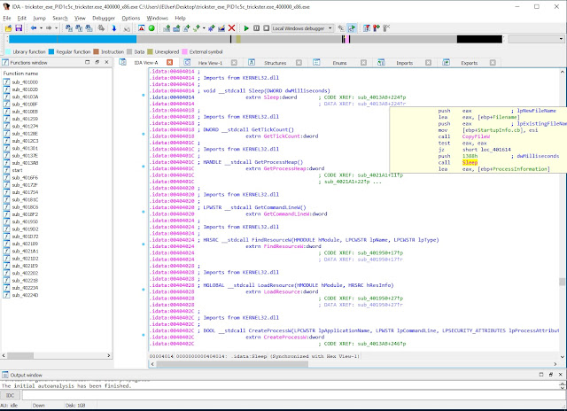 | View from IDA. Sleep function in action as seen in trickster.exe which was dumped from memory. |